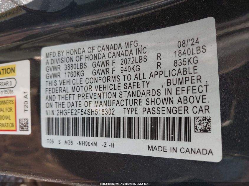 2025 HONDA CIVIC 2025 року Бензин, 2.0, Передний привод, vin - 2HGFE2F54SH518302 из США