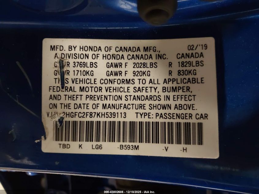 2019 HONDA CIVIC 2019 року Бензин, 2.0, Передний привод, vin - 2HGFC2F87KH539113 из США
