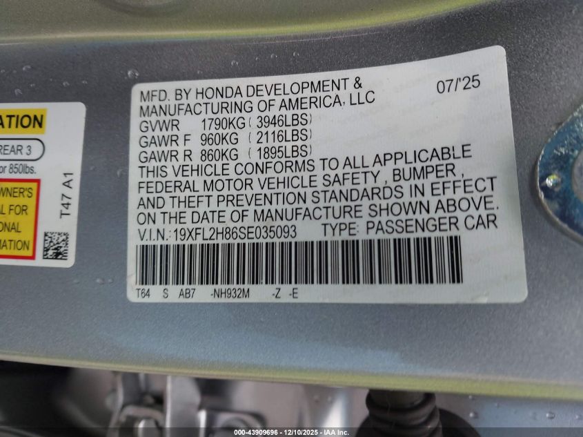2025 HONDA CIVIC 2025 року Бензин, 2.0, Передний привод, vin - 19XFL2H86SE035093 из США