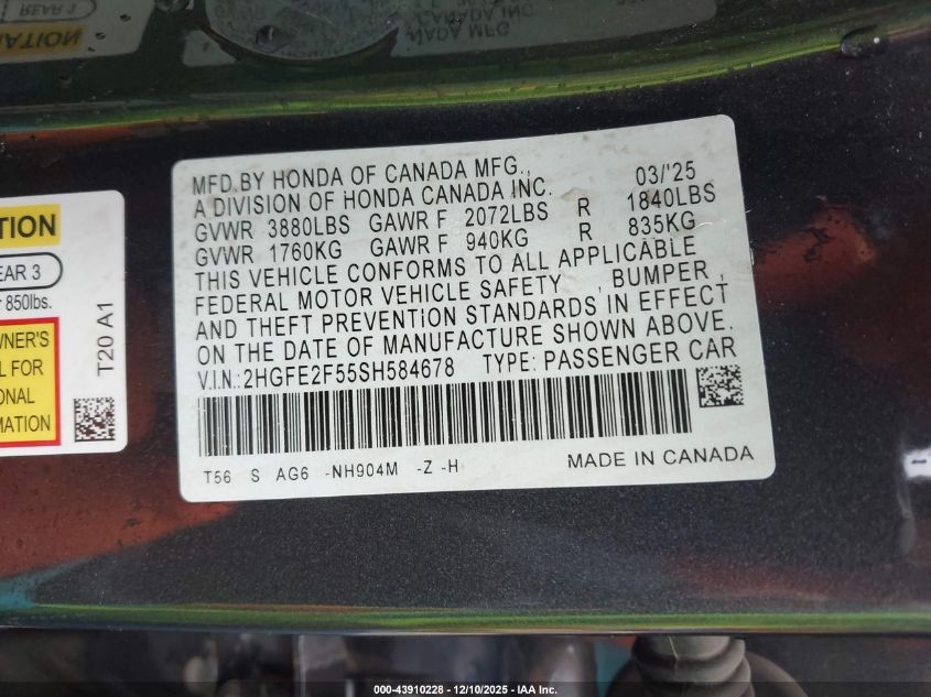 2025 HONDA CIVIC 2025 року Бензин, 2.0, Передний привод, vin - 2HGFE2F55SH584678 из США