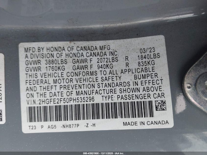 2023 HONDA CIVIC 2023 року Бензин, 2.0, Передний привод, vin - 2HGFE2F50PH535296 из США