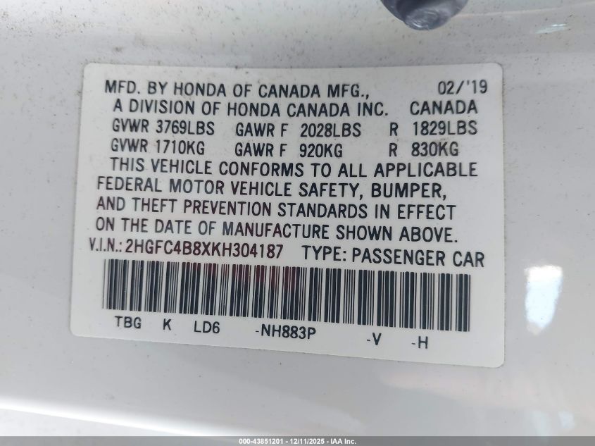 2019 HONDA CIVIC 2019 року Бензин, 2.0, Передний привод, vin - 2HGFC4B8XKH304187 из США