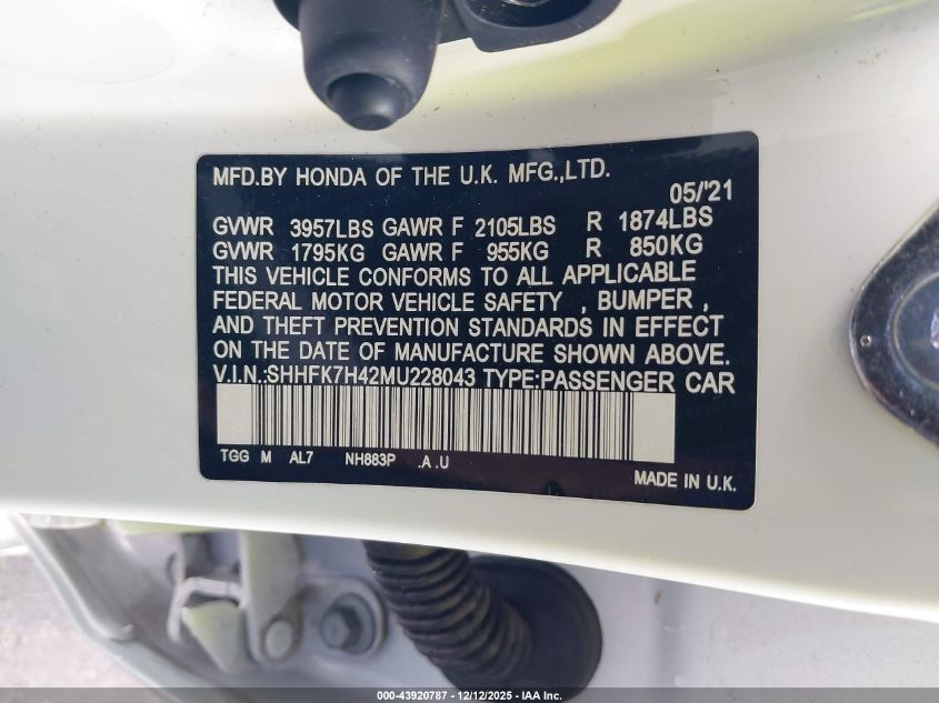 2021 HONDA CIVIC 2021 року Бензин, 1.5, Передний привод, vin - SHHFK7H42MU228043 из США