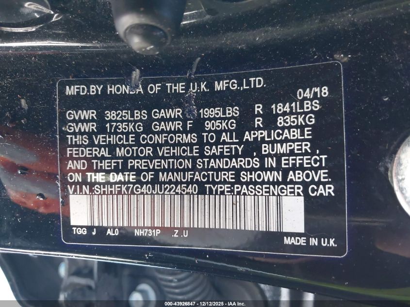 2018 HONDA CIVIC 2018 року Бензин, 1.5, Передний привод, vin - SHHFK7G40JU224540 из США