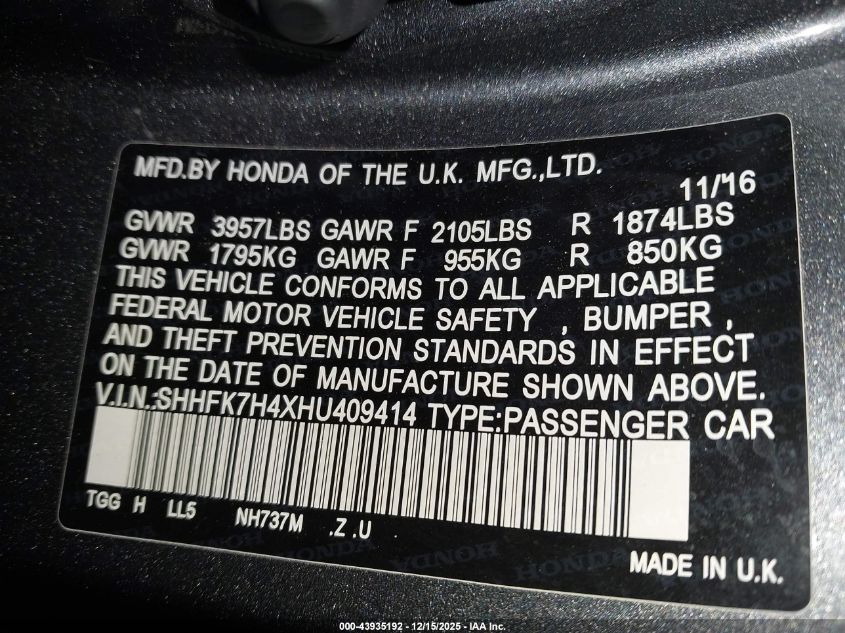 2017 HONDA CIVIC 2017 року Бензин, 1.5, Передний привод, vin - SHHFK7H4XHU409414 из США