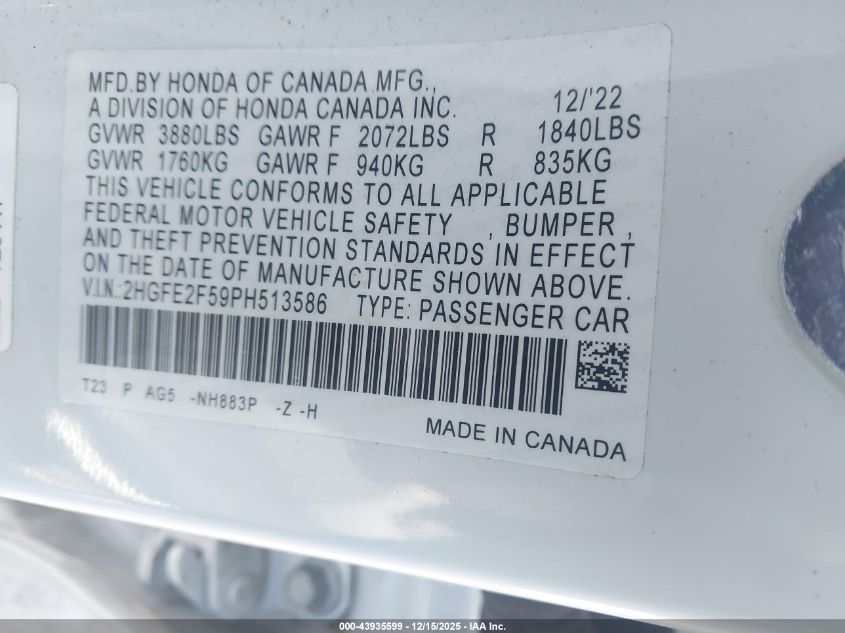 2023 HONDA CIVIC 2023 року Бензин, 2.0, Передний привод, vin - 2HGFE2F59PH513586 из США