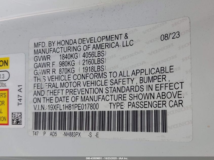 2023 HONDA CIVIC 2023 року Бензин, 1.5, Передний привод, vin - 19XFL1H81PE017800 из США