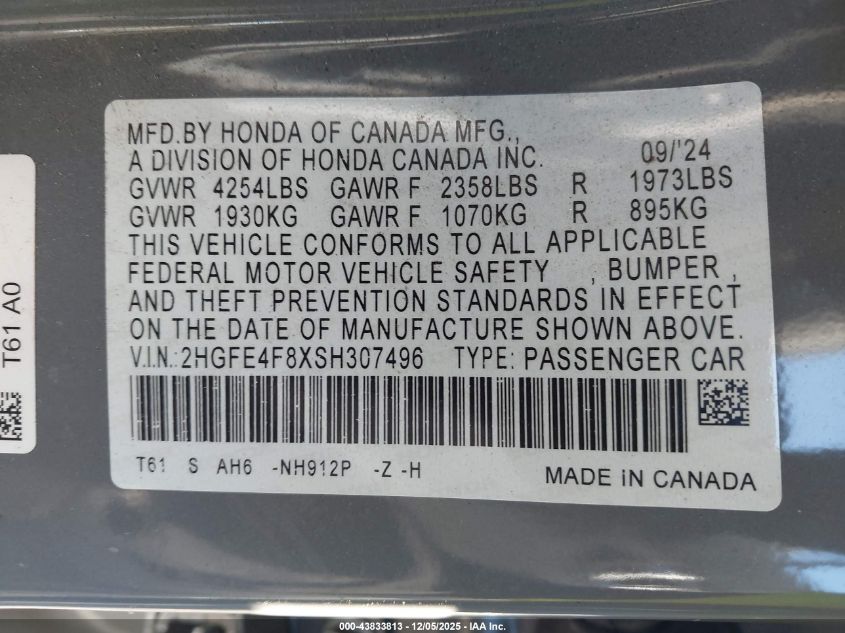 2025 HONDA CIVIC 2025 року Гибрид, 2.0, Передний привод, vin - 2HGFE4F8XSH307496 из США