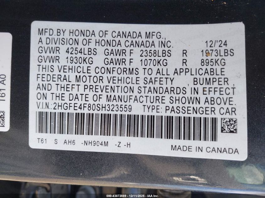 2025 HONDA CIVIC 2025 року Гибрид, 2.0, Передний привод, vin - 2HGFE4F80SH323559 из США