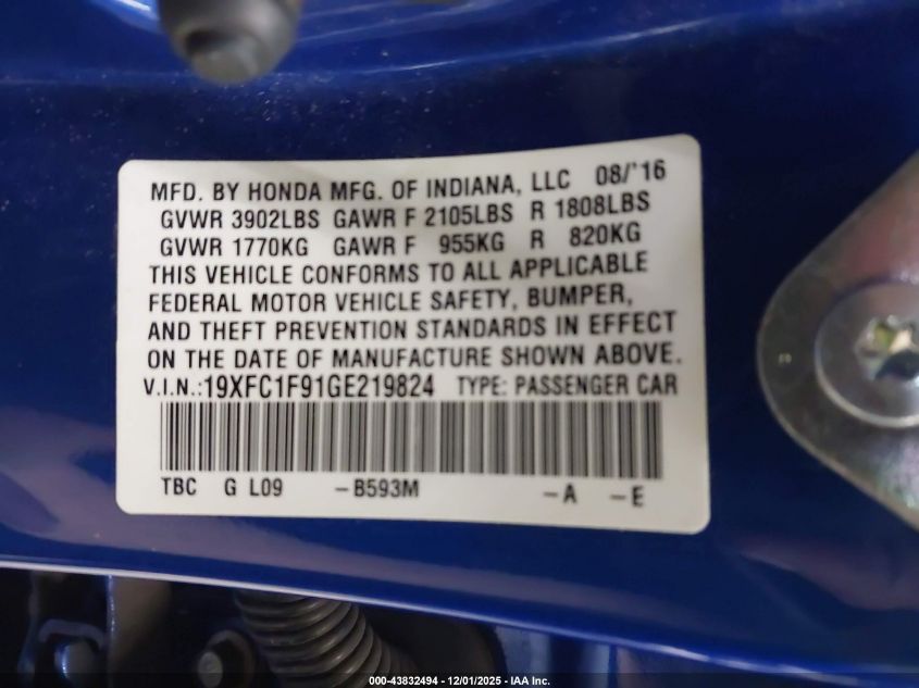 2016 HONDA CIVIC 2016 року Бензин, 1.5, Передний привод, vin - 19XFC1F91GE219824 из США