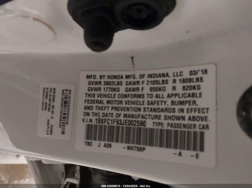 2018 HONDA CIVIC 2018 року Бензин, 1.5, Передний привод, vin - 19XFC1F93JE002590 из США