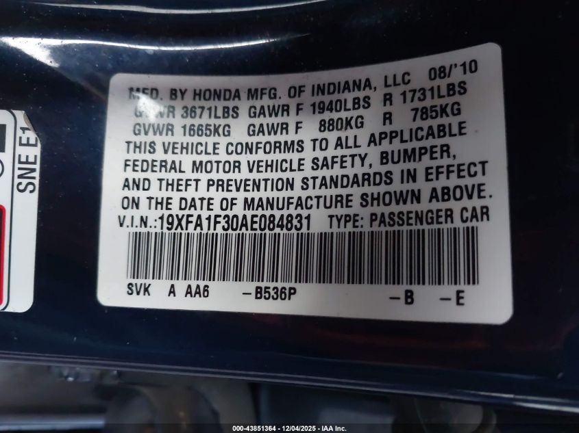 2010 HONDA CIVIC 2010 року Бензин, 1.8, Передний привод, vin - 19XFA1F30AE084831 из США