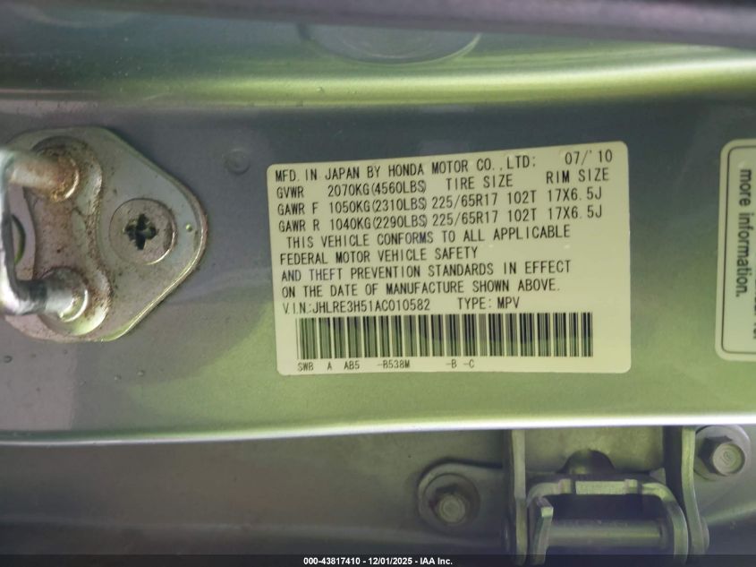 2010 HONDA CR-V 2010 року Бензин, 2.4, Передний привод, vin - JHLRE3H51AC010582 из США
