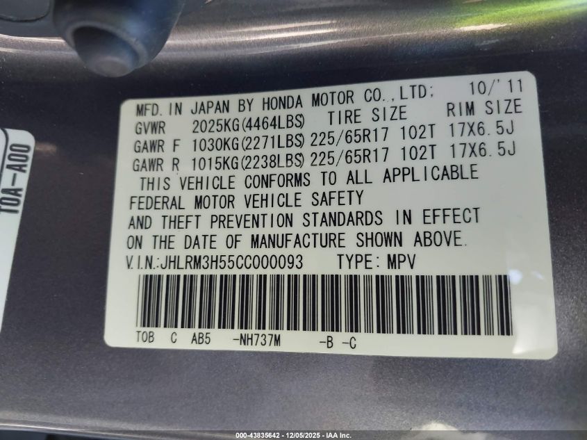 2012 HONDA CR-V 2012 року Бензин, 2.4, Передний привод, vin - JHLRM3H55CC000093 из США