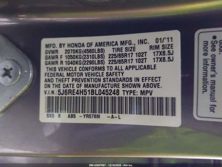 2011 HONDA CR-V 2011 року Бензин, 2.4, Полный привод, vin - 5J6RE4H51BL045248 из США