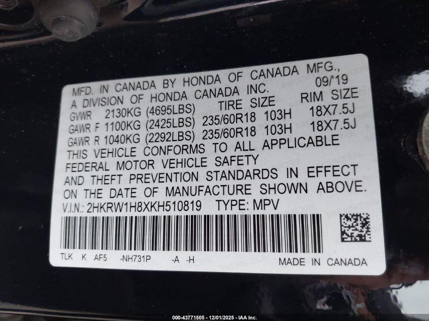 2019 HONDA CR-V 2019 року Бензин, 1.5, Передний привод, vin - 2HKRW1H8XKH510819 из США