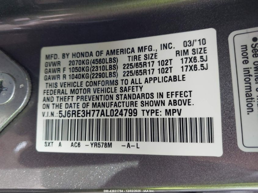 2010 HONDA CR-V 2010 року Бензин, 2.4, Передний привод, vin - 5J6RE3H77AL024799 из США