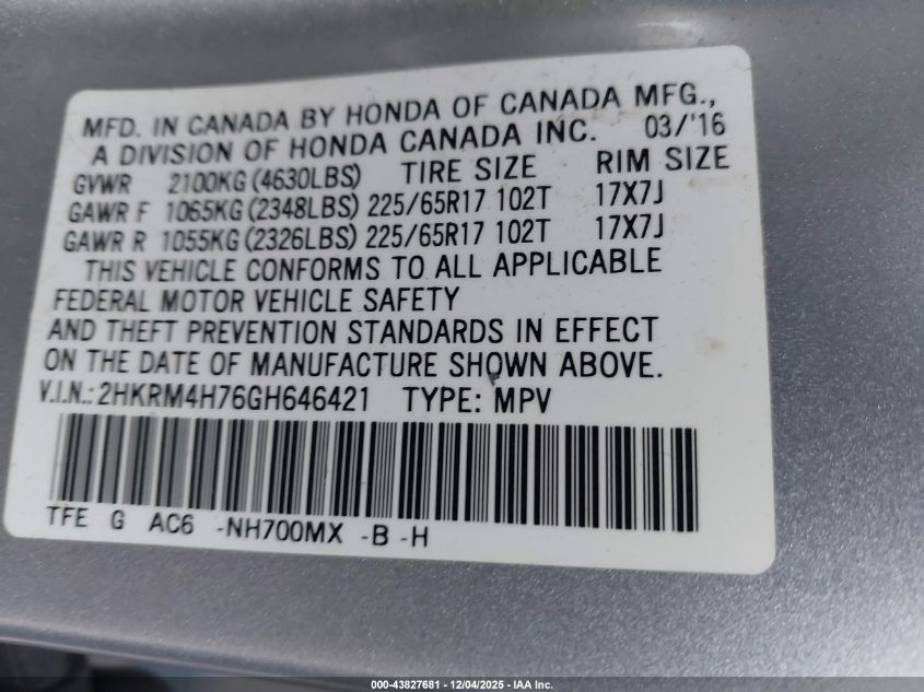 2016 HONDA CR-V 2016 року Бензин, 2.4, Полный привод, vin - 2HKRM4H76GH646421 из США