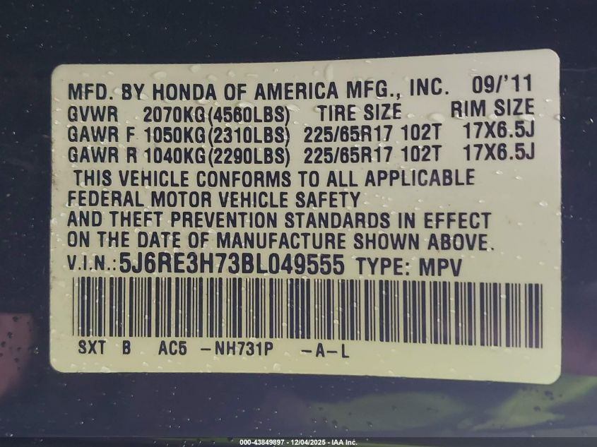 2011 HONDA CR-V 2011 року Бензин, 2.4, Передний привод, vin - 5J6RE3H73BL049555 из США