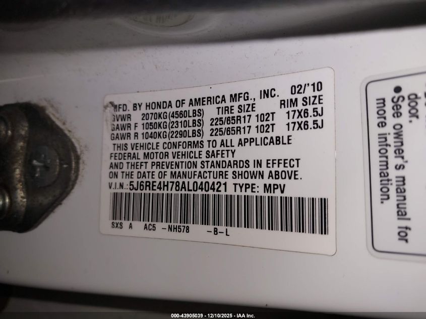 Цвет БелыйЦилиндры 4Привод Полный приводVIN 5J6RE4H78AL040421Состояние СтационарноПовреждения Передняя или задняя AutoRIA