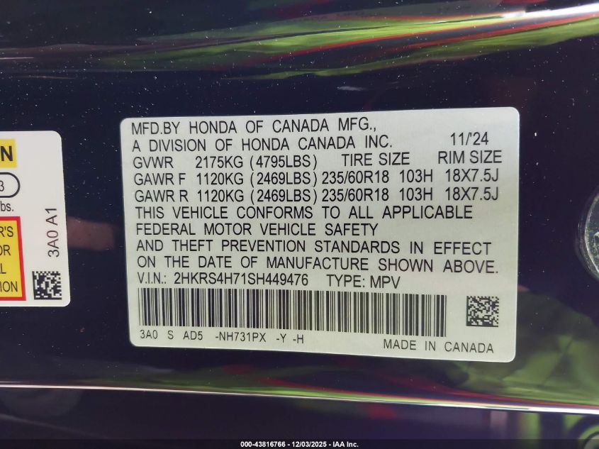 2025 HONDA CR-V 2025 року Бензин, 1.5, Полный привод, vin - 2HKRS4H71SH449476 из США