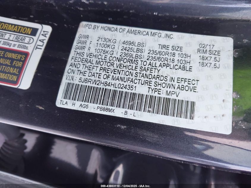 Цвет СерыйЦилиндры 4Привод Полный приводVIN 5J6RW2H84HL024351Состояние Заводится и едет (проверено)Повреждения Левая сторона AutoRIA