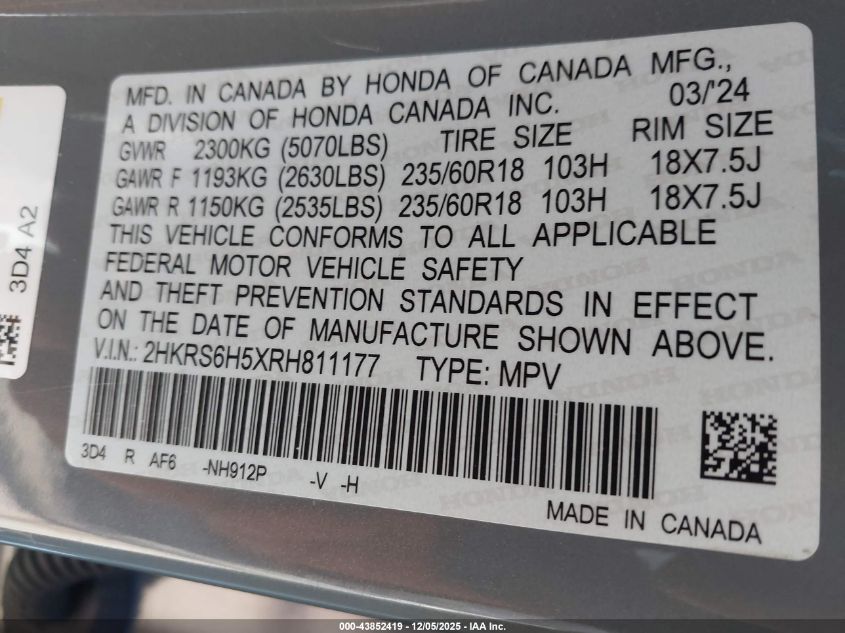 2024 HONDA CR-V HYBRID 2024 року Гибрид, 2.0, Полный привод, vin - 2HKRS6H5XRH811177 из США