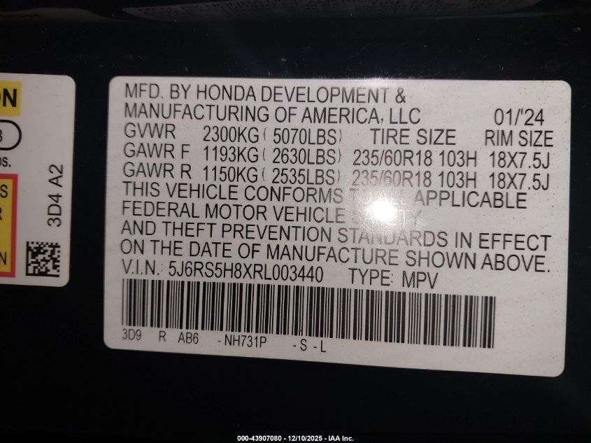 2024 HONDA CR-V HYBRID 2024 року Гибрид, 2.0, Передний привод, vin - 5J6RS5H8XRL003440 из США