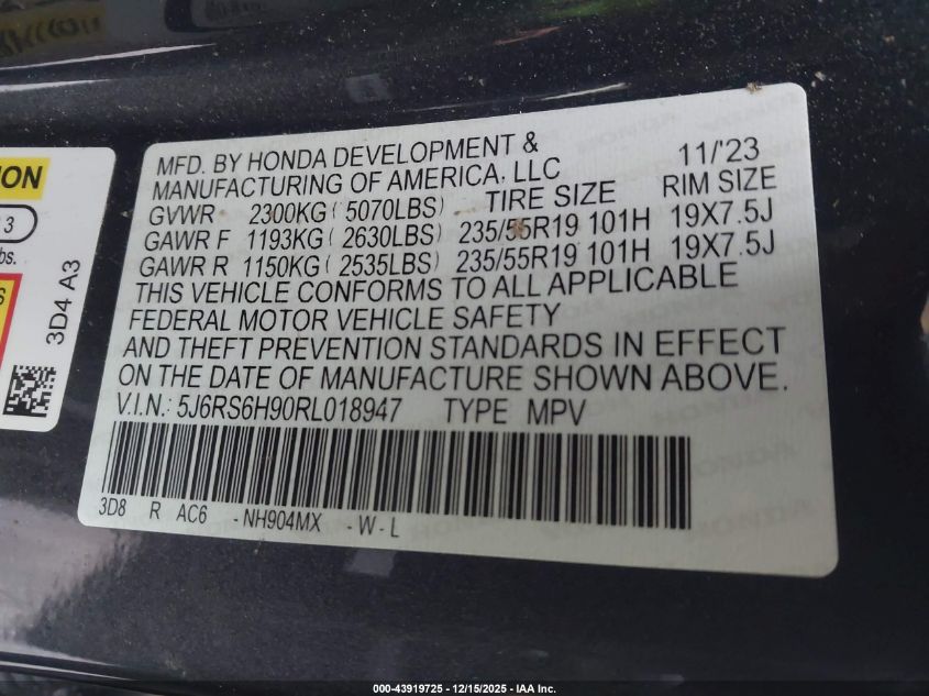 2024 HONDA CR-V HYBRID 2024 року Гибрид, 2.0, Полный привод, vin - 5J6RS6H90RL018947 из США