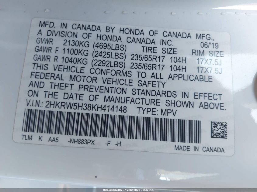 2019 HONDA CR-V 2019 року Бензин, 2.4, Передний привод, vin - 2HKRW5H38KH414148 из США