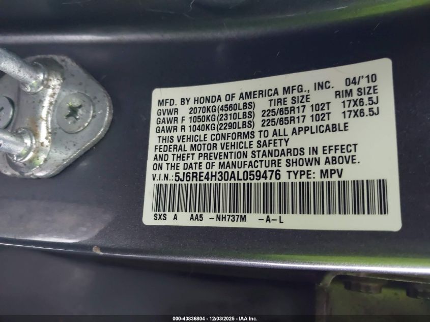 Цвет СерыйЦилиндры 4Привод Полный приводVIN 5J6RE4H30AL059476Состояние Заводится и едет (проверено)Повреждения Передняя или задняя AutoRIA