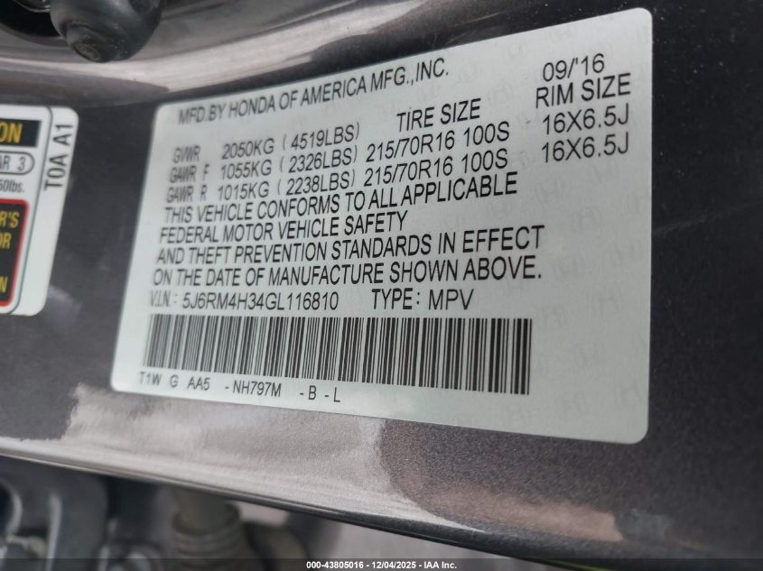 2016 HONDA CR-V 2016 року Бензин, 2.4, Полный привод, vin - 5J6RM4H34GL116810 из США