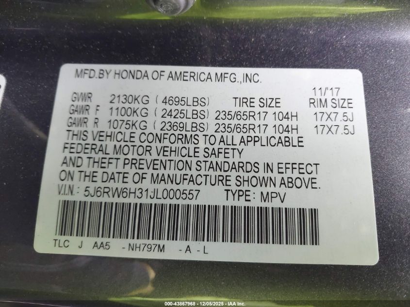 2018 HONDA CR-V 2018 року Бензин, 2.4, Полный привод, vin - 5J6RW6H31JL000557 из США