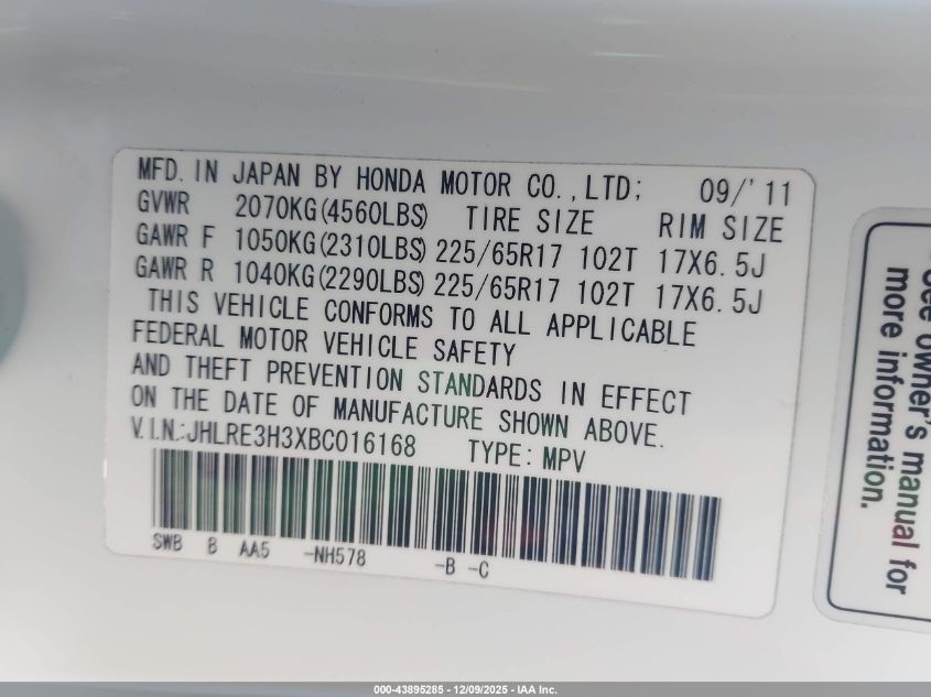 2011 HONDA CR-V 2011 року Бензин, 2.4, Передний привод, vin - JHLRE3H3XBC016168 из США