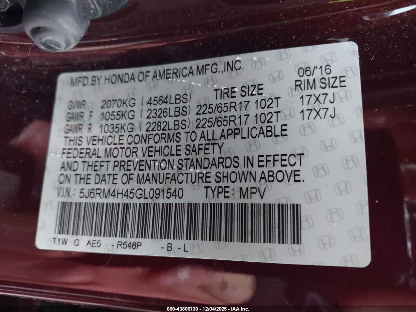 2016 HONDA CR-V 2016 року Бензин, 2.4, Полный привод, vin - 5J6RM4H45GL091540 из США