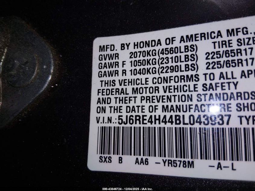 Цвет СерыйЦилиндры 4Привод Полный приводVIN 5J6RE4H44BL043937Состояние Заводится и едет (проверено)Повреждения Передняя или задняя AutoRIA