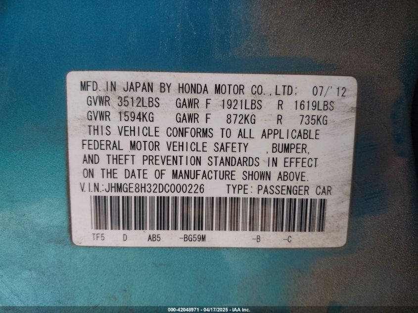 Цвет БирюзовийЦилиндры 4Привод Передний приводVIN JHMGE8H32DC000226Состояние Заводится и едет (проверено)Повреждения Передняя или задняяДата аукциона 2025-12-08 AutoRIA