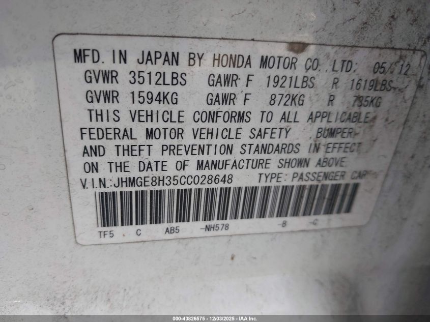 2012 HONDA FIT 2012 року Бензин, 1.5, Передний привод, vin - JHMGE8H35CC028648 из США