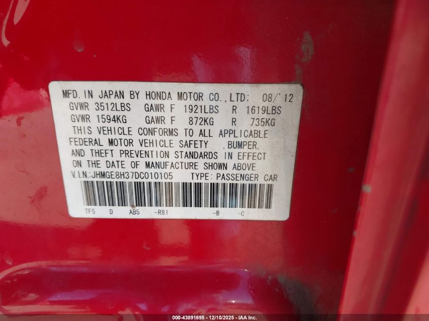 Цвет КрасныйЦилиндры 4Привод Передний приводVIN JHMGE8H37DC010105Состояние Заводится и едет (проверено)Повреждения Передняя или задняя AutoRIA