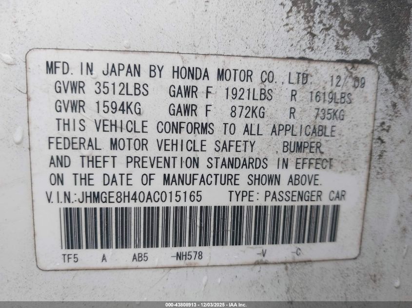 Цвет БелыйЦилиндры 4Привод Передний приводVIN JHMGE8H40AC015165Состояние Заводится и едет (проверено)Повреждения Передняя или задняя AutoRIA