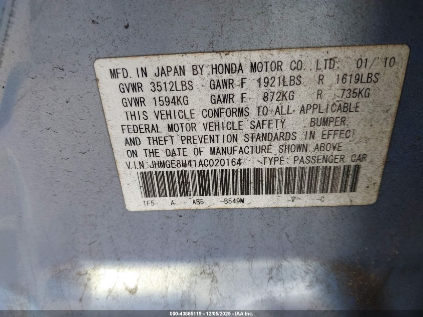 2010 HONDA FIT 2010 року Бензин, 1.5, Передний привод, vin - JHMGE8H41AC020164 из США