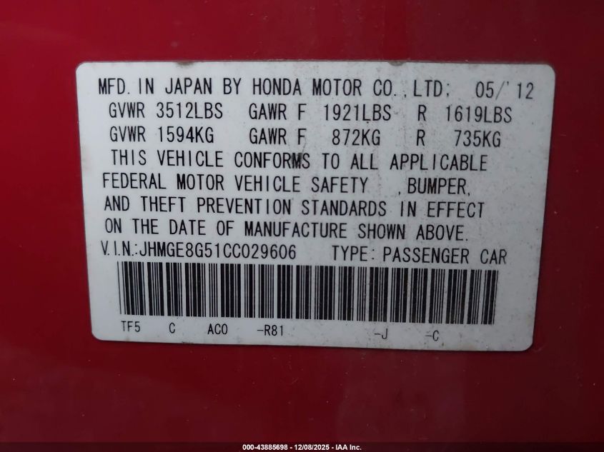 2012 HONDA FIT 2012 року Бензин, 1.5, Передний привод, vin - JHMGE8G51CC029606 из США