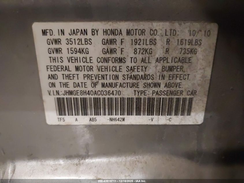 2010 HONDA FIT 2010 року Бензин, 1.5, Передний привод, vin - JHMGE8H40AC036470 из США