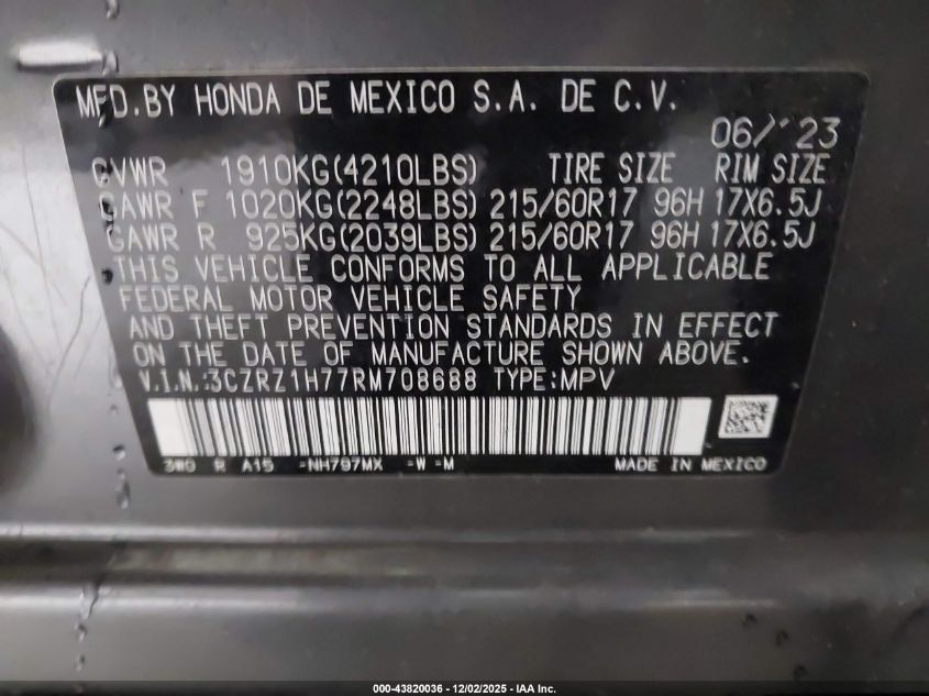 2024 HONDA HR-V 2024 року Бензин, 2.0, Передний привод, vin - 3CZRZ1H77RM708688 из США