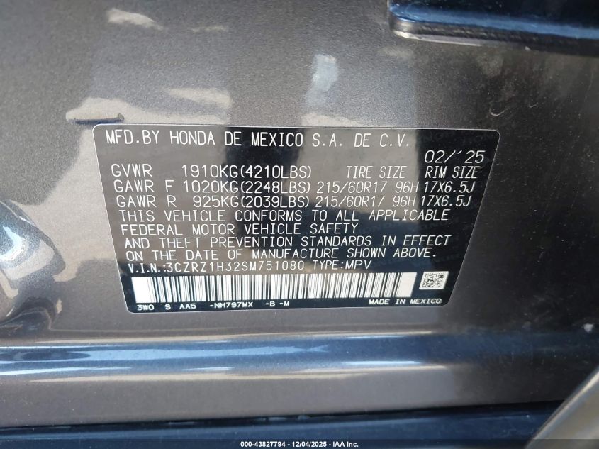 2025 HONDA HR-V 2025 року Бензин, 2.0, Передний привод, vin - 3CZRZ1H32SM751080 из США