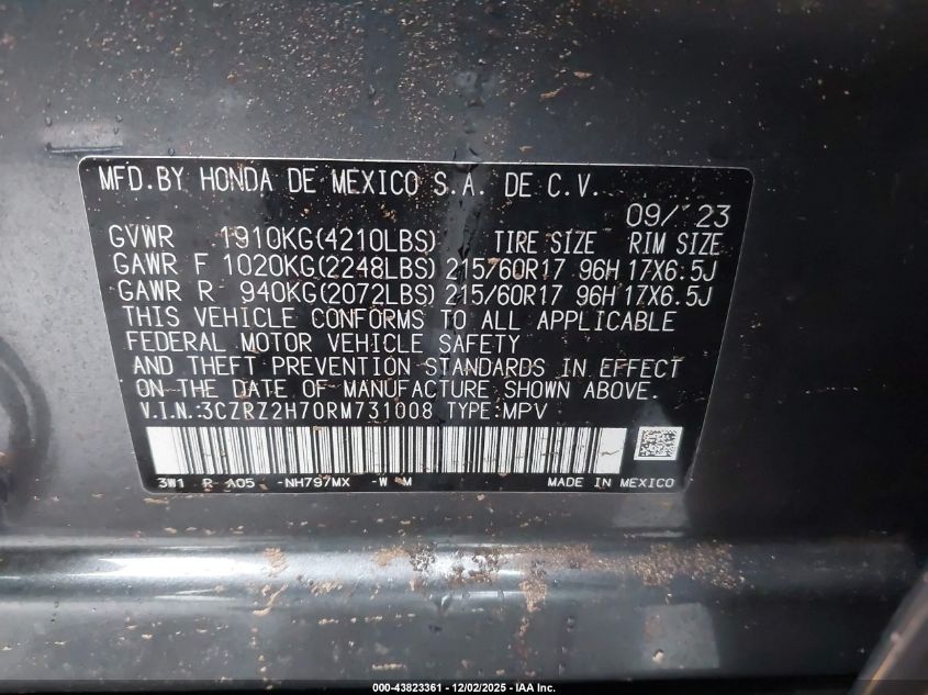 2024 HONDA HR-V 2024 року Бензин, 2.0, Полный привод, vin - 3CZRZ2H70RM731008 из США