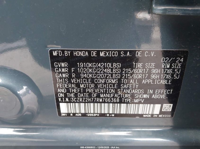 2024 HONDA HR-V 2024 року Бензин, 2.0, Полный привод, vin - 3CZRZ2H77RM766368 из США