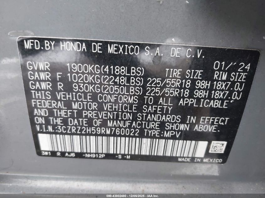 2024 HONDA HR-V 2024 року Бензин, 2.0, Полный привод, vin - 3CZRZ2H59RM760022 из США