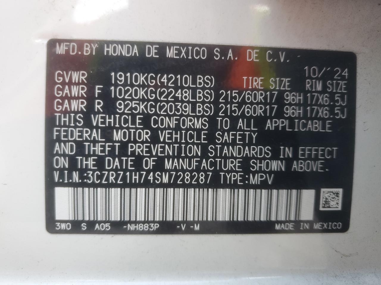 2025 HONDA HR-V 2025 року Бензин, 2.0, , vin - 3CZRZ1H74SM728287 из США