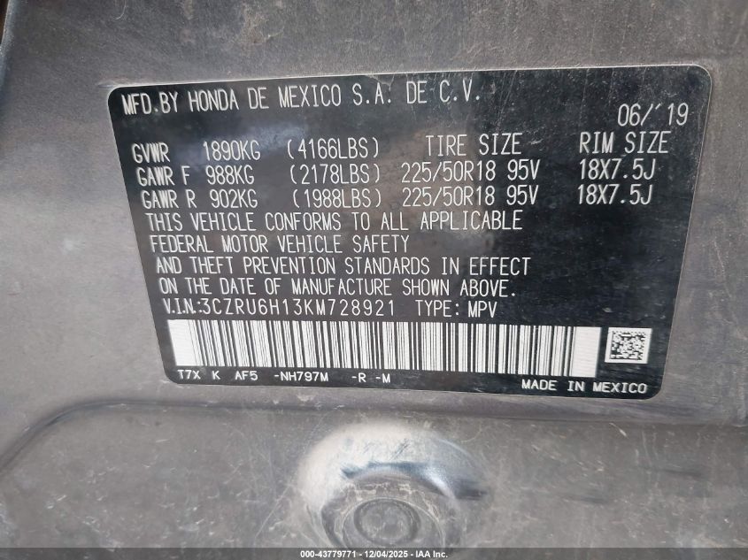 2019 HONDA HR-V 2019 року Бензин, 1.8, Полный привод, vin - 3CZRU6H13KM728921 из США